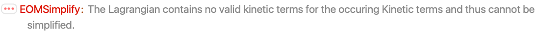 Verbose True whether or not the function reports on its progress. Can be True or False. DummyCoefficients False determines whether the module replaces operator coefficients by temporary variables before applying the reductions. For Lagrangians where the matching coefficients consist of complicated loop functions, this can yield a better performance. EFTOrder All specifies the targeted order in power-counting to which field redefinitions are applied. The standard option All determines the order from the input Lagrangian and keeps the output at the same order. EffectiveCouplingSymbol "C" the standard symbol used for effective couplings which are generated for superleading terms. ReductionIdentities EvanescenceFree specifies whether or not to use the subset of identities valid only in 4 dimensions (fierz, gamma reduction and Levi-Civita relations) in intermediate simplifications. - The option EFTOrder takes either an integer value greater or equal to 4, or the symbol All. In the latter case, EOMSimplify determines the order in power-counting from the input Lagrangian. When the option value is lower than the maximal order of the Lagrangian, redundant operators are only removed up to the specified order.